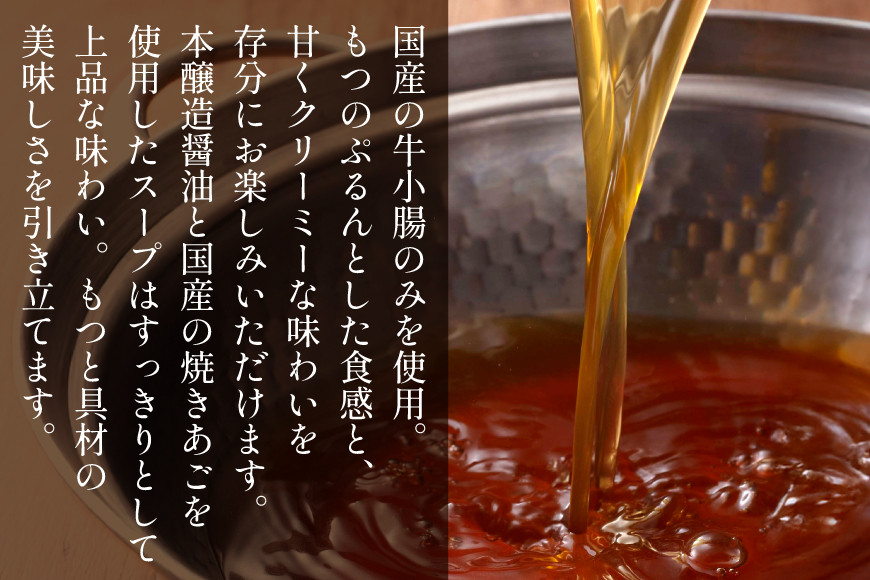 本醸造醤油と国産の焼きあごを使用したスープはすっきりとして上品な味わい。もつと具材の美味しさを引き立てます。