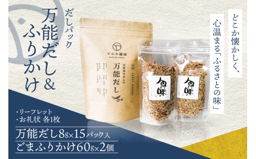 ひとふり、ひと煮出しで、料亭の味。無添加の優しさをご家庭に 万能だし 8g 15パック入 1袋 ごまふりかけ 60g 2袋 セット [マルト醤油醸造元 福岡県 宇美町 um40azo720012] だしパック 出汁パック ふりかけ メール便 メール便対応