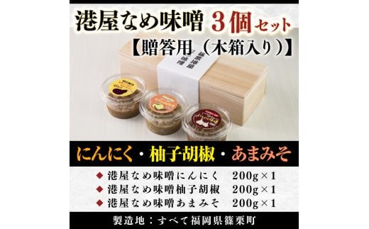 容量 | ■内容量/製造地 港屋なめ味噌にんにく 200g×1 港屋なめ味噌柚子胡椒 200g×1 港屋なめ味噌あまみそ 200g×1 製造地:すべて福岡県篠栗町 ■原材料 お礼品のラベルに記載 ※アレルギー物質などの表示につきましては、お礼品に記載しています。 |