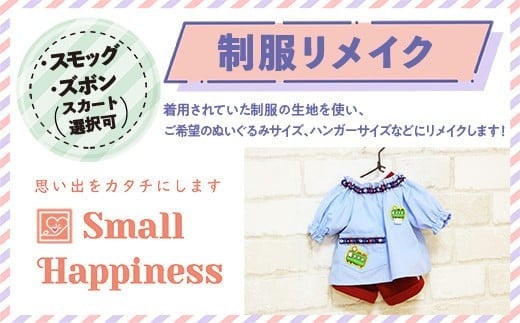 お子様の制服姿の記憶をリメイクしていつでも思い出すことができます。思い出の詰まった制服をなかなか処分できず、長年タンスに保管されてませんか?捨てられずにしまい込んでいた大切な思い出が詰まった制服を、お気に入りのぬいぐるみサイズなどにリメイクして、ずっと身近に置いておくことができます。一目見て一瞬で思い出が蘇るように、1着1着バランスよく心をこめてリメイクいたします。 着用されていた制服をお送り頂き、その生地を使って、ご希望のぬいぐるみサイズ、ハンガーサイズなどにリメイクいたします。高い技術を持った職人が1着1着心をこめて、制服に詰まった思い出が「カタチ」になるようにリメイクします。 提供元 スモールハピネス