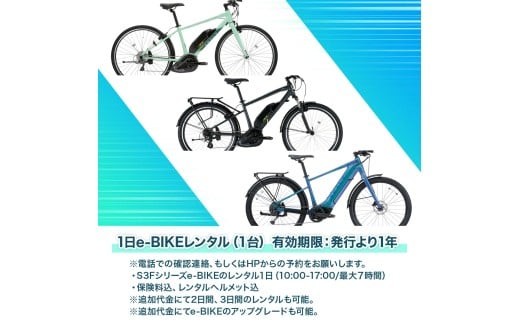 容量 | S3Fシリーズe-BIKEのレンタル1日(10:00-17:00/最大7時間) ※保険料込、レンタルヘルメット込 |