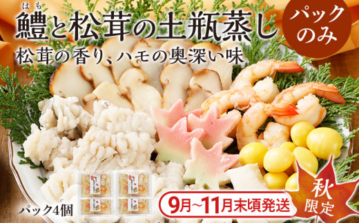 秋限定の中でも人気お取り寄せ商品の「鱧と松茸の土瓶蒸し」です。 <期間限定> 九州産 鱧と松茸の土瓶蒸し 老舗(出汁パック セット) 4パック 秋限定 松茸 鱧 ハモ イカ 銀杏 生麩 土瓶蒸し 敬老の日 ギフト プレゼント 贈り物 器 送料無料 秋限定