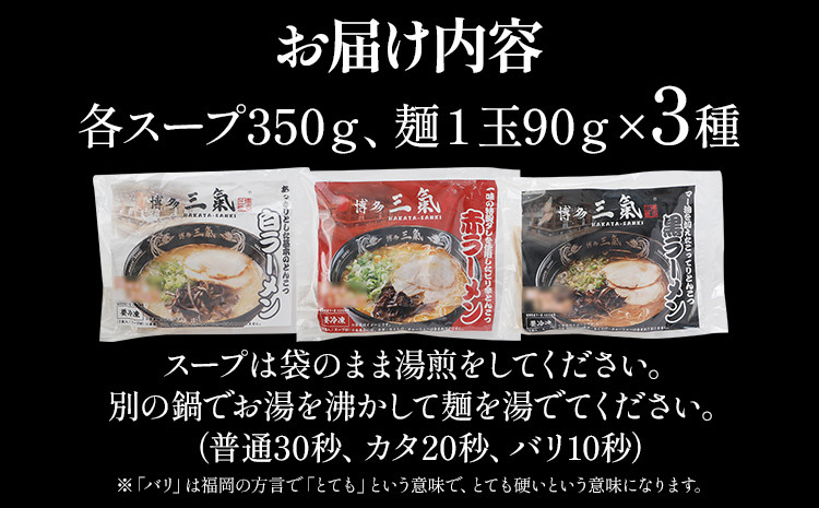 博多三氣のラーメン白、赤、黒の3種類の食べ比べセットです。 とんこつラーメン 博多三氣 食べ比べセット(3種各1食)豚骨 トンコツ ラーメン らーめん 麺 スープ ラー麦100% 赤 黒 白 具材なし 冷凍 博多 博多らーめん お取り寄せ グルメ ご当地グルメ 福岡 三氣 バリカタ