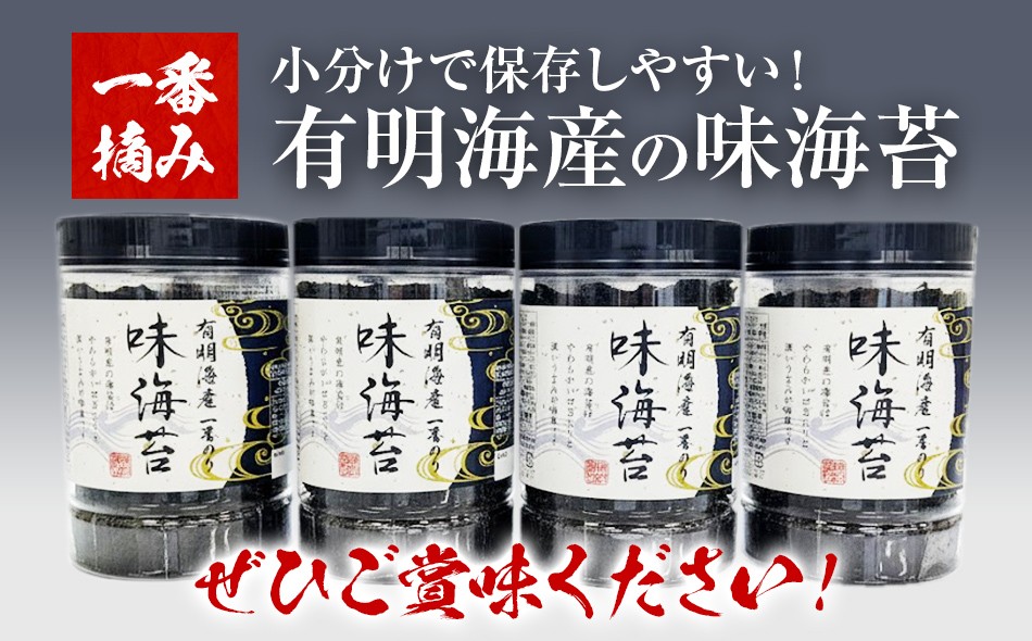 有明海産一番摘みの味海苔ボトルです。1ボトルに80枚×4本セットのお品です。