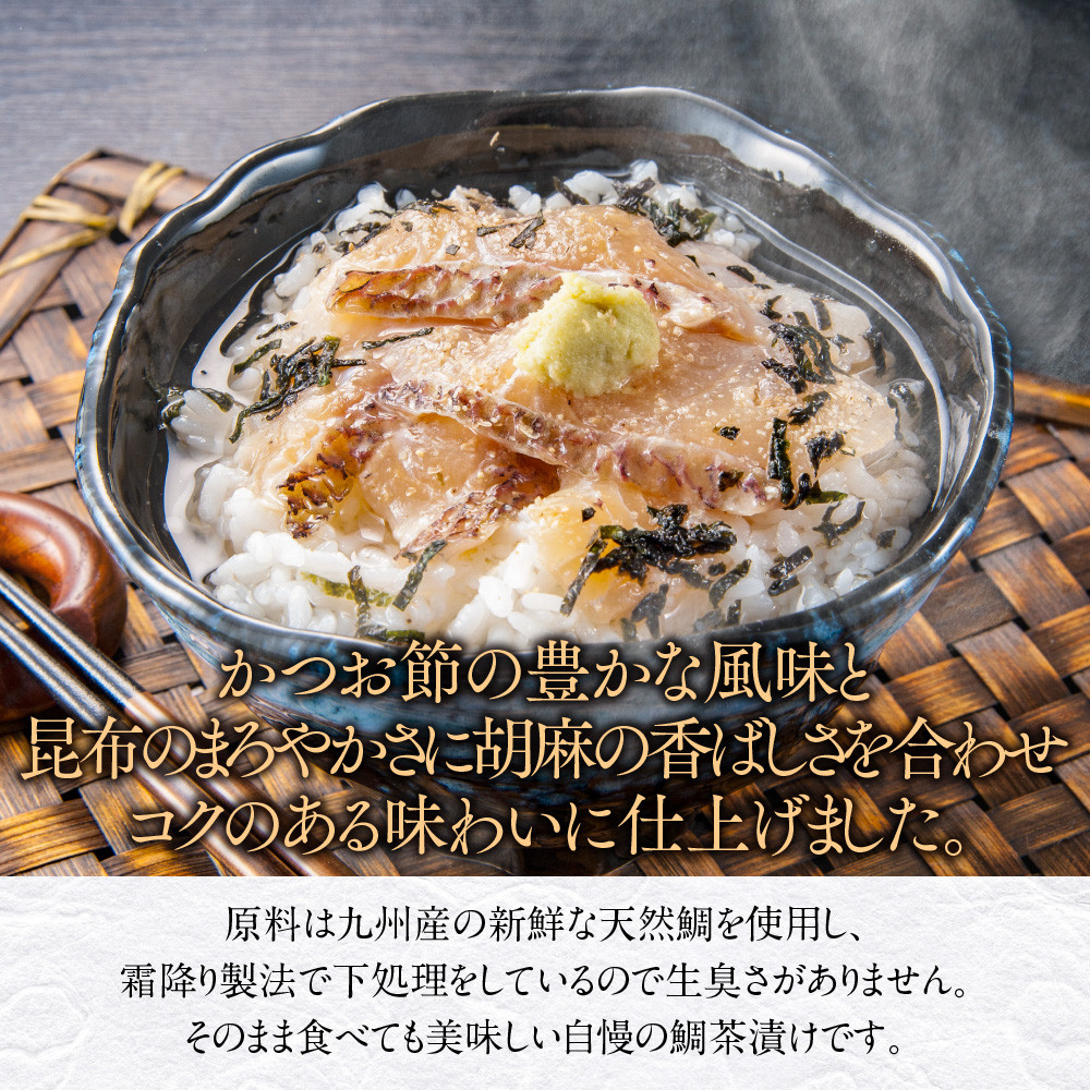 かつお節の豊かな風味と昆布のまろやかさに胡麻の香ばしさを合わせ、コクのある味わいに仕上げました。原料は九州産の新鮮な天然鯛を使用し、霜降り製法で下処理をしているので生臭さがありません。