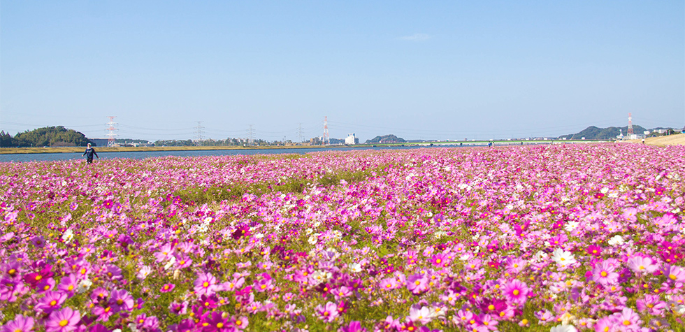 「稲作文化の発祥地」として知られる水巻町は福岡県の北部に位置し、面積は11.01平方キロメートルで、東は北九州市に隣接し、西は遠賀川に挟まれた南北に細長い町です。秋には遠賀川のほとりの河川敷公園に、町花の「コスモス」約500万本が全長6キロに渡ってピンクの花を咲かせ、鮮やかに町を彩ります。