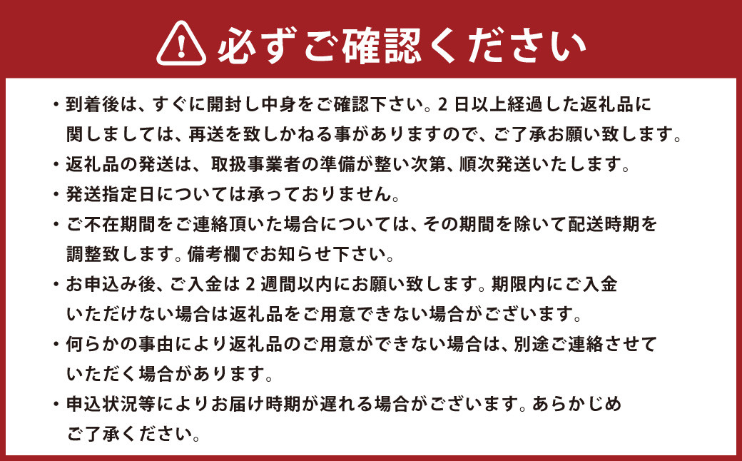 ・到着後は、すぐに開封し中身をご確認下さい。2日以上経過した返礼品に関しましては、再送を致しかねる事がありますので、ご了承お願い致します。