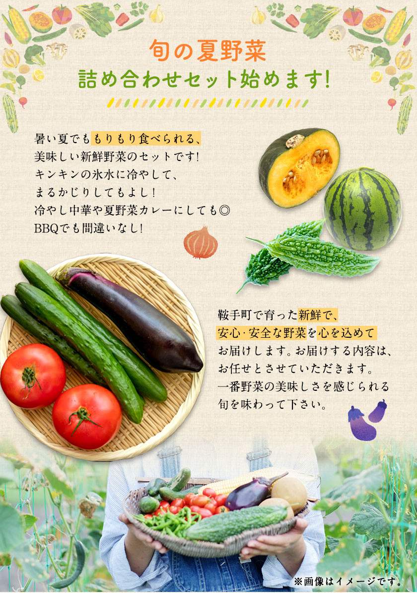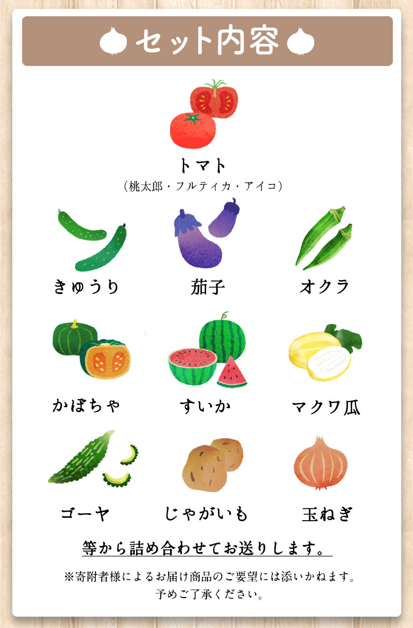 トマト(桃太郎、フルティカ、アイコ)、オクラ、きゅうり、茄子、かぼちゃ、すいか、マクワ瓜、ゴーヤ、じゃがいも、玉ねぎ等から詰め合わせてお送りします。