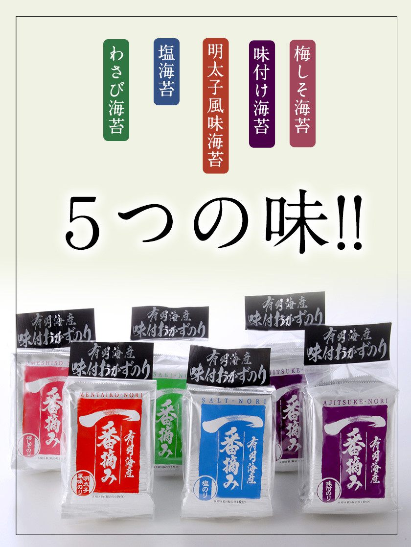 ご飯のお供だけでなく、おやつにも、お酒のお供にも! 有明海産一番摘み「味付けおかず海苔6袋入詰合セット」(5つの味、180枚) 福岡有明のり 株式会社有明海苔 《30日以内に出荷予定(土日祝除く)》鞍手郡