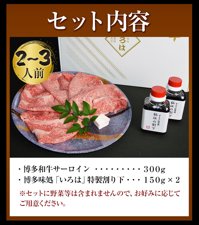 | 容量 | ・博多和牛サーロイン 300g ・博多味処「いろは」特製割り下 150g×2 ※セットに野菜等は含まれませんので、お好みに応じてご用意ください。 |