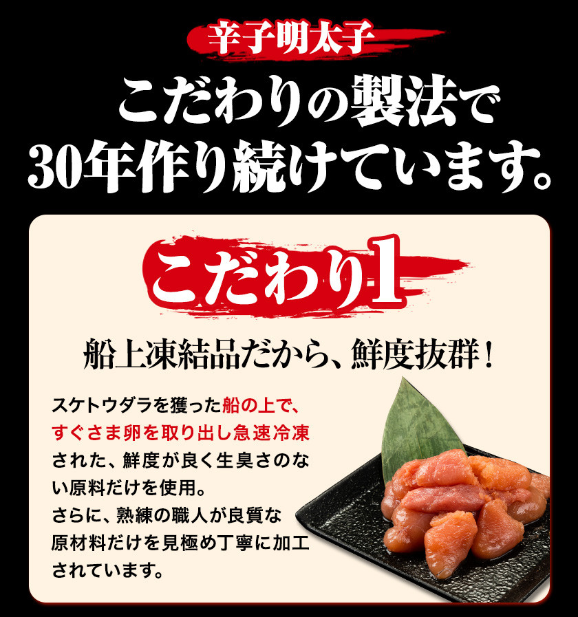 昆布と鰹出汁の奥深い旨味。アツアツのご飯にあうピリッとした程よい辛さ。辛子明太子を作り続けて30年。原料だけでなく調味料も素材から徹底的にこだわっています。
