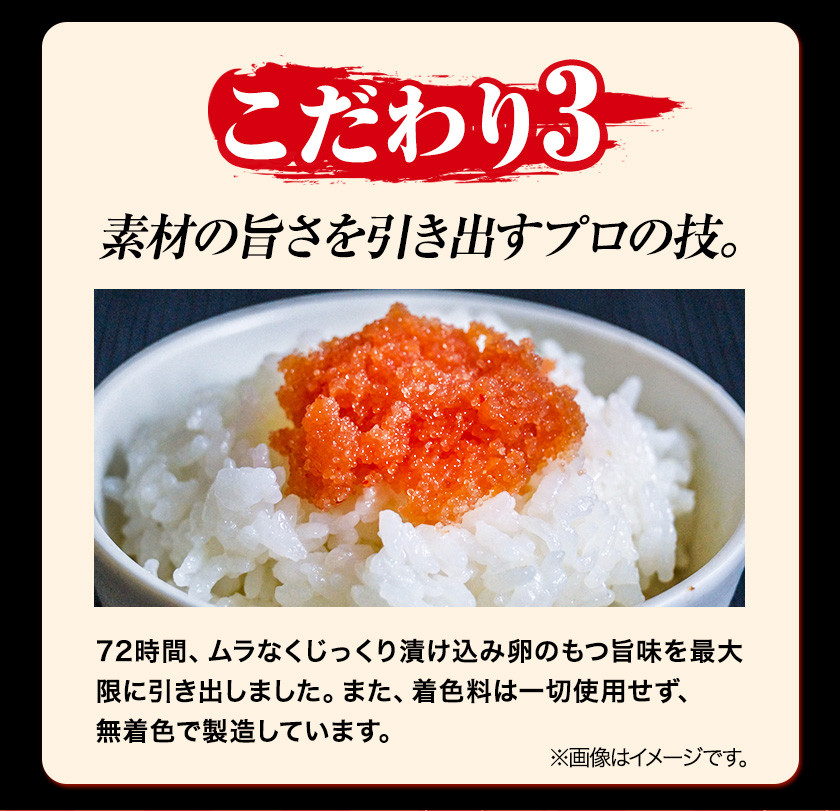 72時間、ムラなくじっくり漬け込み卵のもつ旨味を最大限に引き出しました。また、着色料は一切使用せず無着色で製造しています。素材の上手さを引き出すプロの味をご堪能下さい!