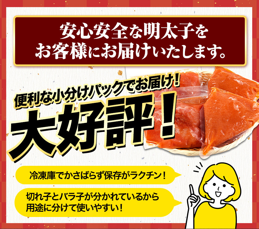 製造の過程で切れてやぶれてしまった明太子ですが、美味しさはそのままの訳あり限定品!素材から厳選された特性調味液と程よい辛さの味付けで、福岡伝統の辛子明太子本来の味を楽しめます。
