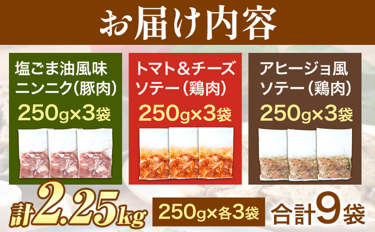 焼くだけ簡単!3つの味が楽しめる! 肉 鶏肉 豚肉 味付き肉 国産鶏と国産豚の3種味付けセット 計2.25kg 計9袋(250g×各3袋) MK エム・ケイ食品《60日以内に順次出荷(土日祝除く)》福岡県 鞍手町 塩ごま油風味ニンニク トマト&チーズソテー アヒージョ風 簡単調理 焼くだけ 小分け 送料無料