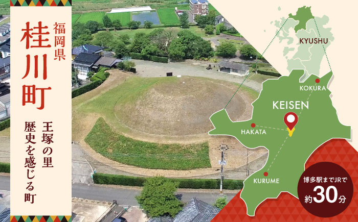 桂川町は福岡県のほぼ中央に位置し、JR篠栗線・筑豊本線で福岡市と30分で結ばれ、福岡都市圏におけるベッドタウンとしての役割を担っています。また、昭和9年に発見され、同27年に国の特別史跡の指定を受けた王塚古墳は、全国に比類なき装飾古墳として、町民の誇りとなっています。豊かな自然と人が共生し、小さい町の特性を生かしコンパクトでも利便性の高い、みんなが笑顔になれるまちづくりを進めています。