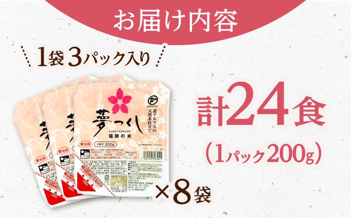 | 容量 | 夢つくしパックごはん 計24パック ※200gのパックご飯が、1袋に3つ入っています。 【原料原産地】福岡県産 【品種】夢つくし 【使用割合】単一原料米 【精米年月日】賞味期限で記載 |