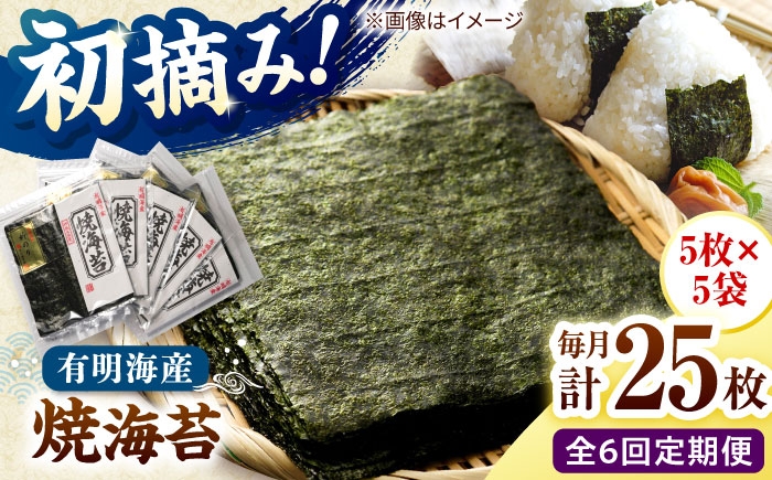 今年の初摘みの新海苔です。新海苔特有の味・艶・香りをご堪能ください。最高級焼海苔 【全6回定期便】初摘み新海苔 焼海苔5袋セット 全形5枚×5袋 福岡有明のり 桂川町/株式会社木村食品 [ADCG081]