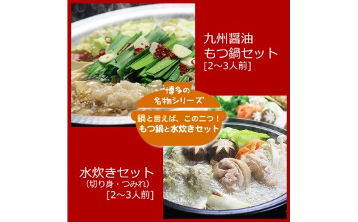 <博多鍋セット>【4】博多の人気2大鍋のセット「九州醤油もつ鍋」と「博多水炊き(切り身)」4~6人前 D23J【もつ鍋 もつ 牛もつ ホルモン 牛肉 小腸 鍋 もつ鍋 モツ鍋 味噌 みそ 水炊き 水たき 鳥肉 鶏肉 はかた地どり 国産 鍋セット 食べ比べ 博多名物 お取り寄せ グルメ 筑前町 ふるさと納税 送料無料 DV047】