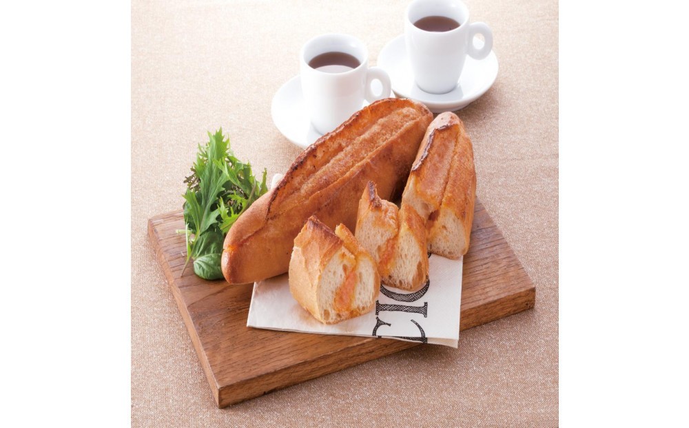明太子屋こだわりの無着色明太子と国産の無塩バターを使った【特製明太バター】をフランスパンにたっぷりと塗りこみました。