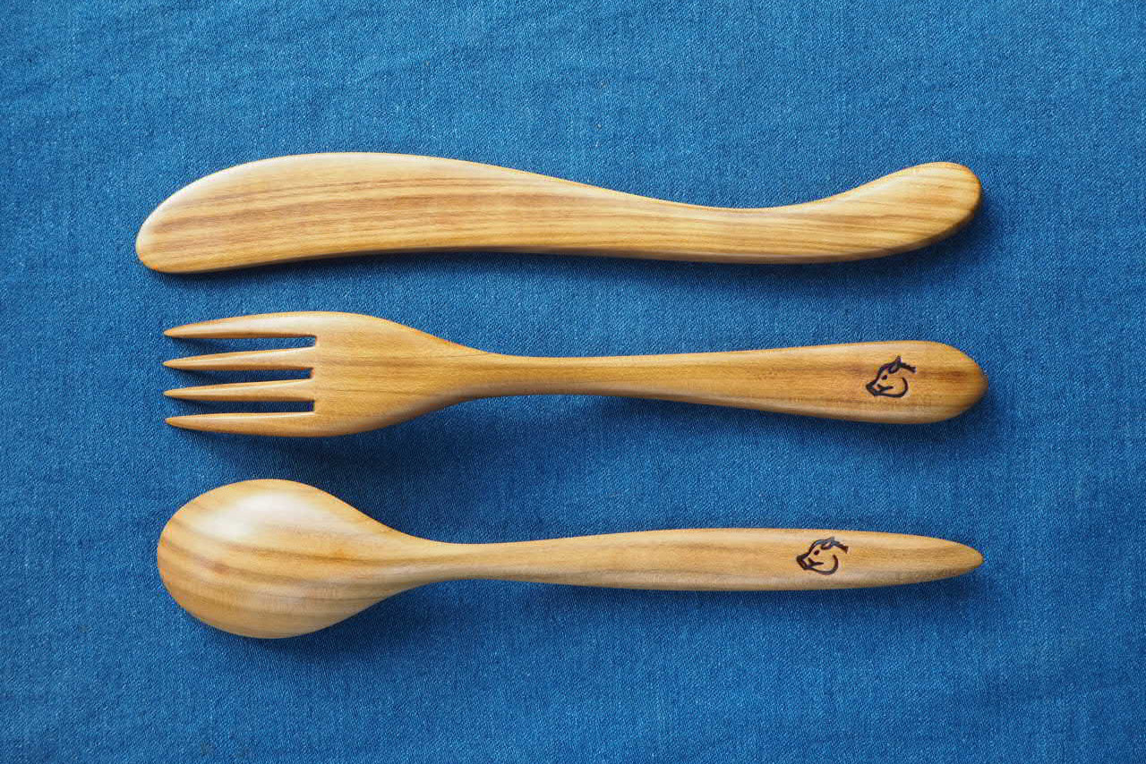 ナイフは持ち手の部分が手の中に納まるように作られ、フォークはノコとナイフで削り出し、スプーンは、スクイ部分を彫刻刀で手彫りして作られています。
