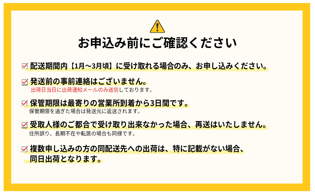 ●先行予約の商品です ●発送前の事前連絡はございません (出荷当日に出荷通知メール送信のみ) 入金確認後、お申込み順に2026年1月から発送予定 ※2026年1月、2月、3月(計3回)にお届けいたします。 ※収穫により、発送時期が前後する可能性がございます。 ※配達指定日不可(時間帯のみ指定可) ※不在日は必ず備考欄に入力、あるいは直接メールにてご連絡ください。(長期保管不可のため) |