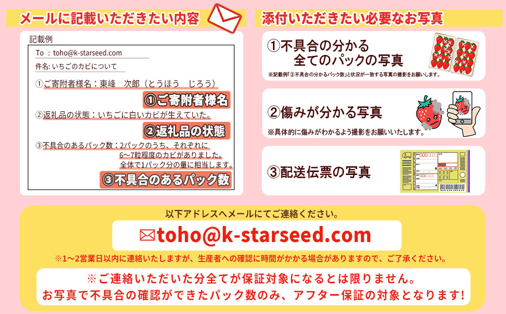 発送連絡の後、遅れなくヤマトクール便で到着しました。新聞紙で丁寧に梱包して頂いておりましたが、大粒のいちごがパックいっぱいに詰まっているため、多少の変色があるものがありました。