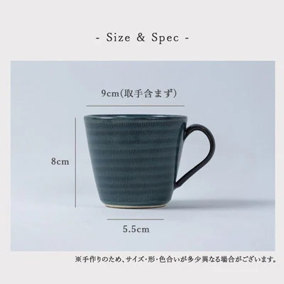 | 容量 | 小石原焼 原彦窯 マグカップ(ネイビー・マット) [1点] 製造地:福岡県東峰村 ■原材料・成分 陶器(土と釉薬) サイズ 直径:9cm(取っ手含まず) 底径:5.5cm 高さ:8cm 容量:300cc |