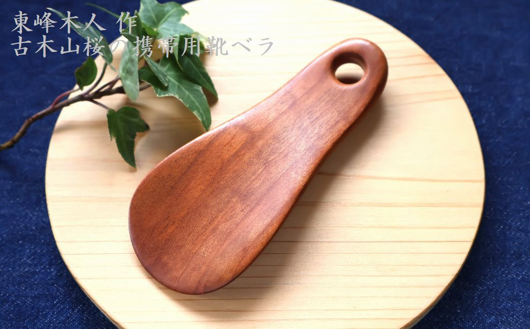 樹齢200年以上の古木山桜の無垢材から切り出して丁寧な手仕事で作られた作品で、革靴はもちろん、ヒールやスニーカー、スポーツシューズを履くときにも便利な携帯用の靴べらです。