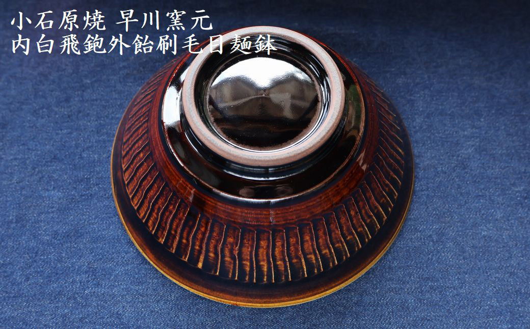 この麺鉢は、小石原焼窯元「早川窯元」にお願いして作っていただいた作品で、内側は乳白色の化粧土に飛鉋、外側は刷毛目に飴釉の実用的で美しい小石原焼の「用の美」を感じていただける作品です。