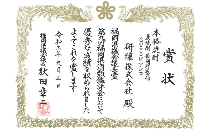 第九回福岡県酒類鑑評会にて「GUFO(ビアンコ)」が福岡県議会議長賞を受賞。