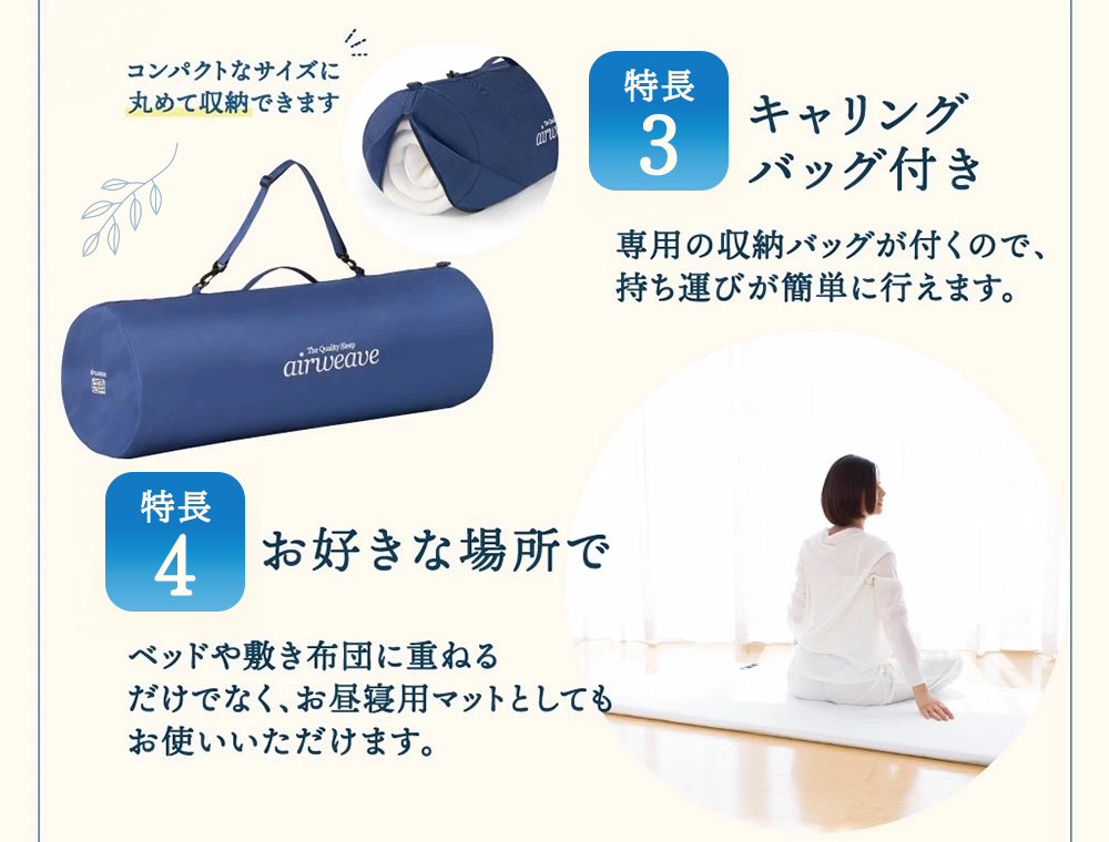 今お使いの寝具に一枚重ねていただくだけで、お手軽にワンランク上の寝心地をご体感頂けます。 薄型なので、今お使いの寝具の寝心地をいかし、お気軽に睡眠環境のグレードアップが可能です。折り畳むだけでなく、丸めることもできるので、収納も楽に行えます。 ※画像はイメージです。 ※一部地域でお届けできない場合がございます。 ※お届け済のお礼品の返品は「株式会社 エアウィーヴ(大刀洗工場)」の責任によるお礼品の不良以外はお受けできません。 ※返礼品配送についてのご要望はお受けできません。予めご了承ください。