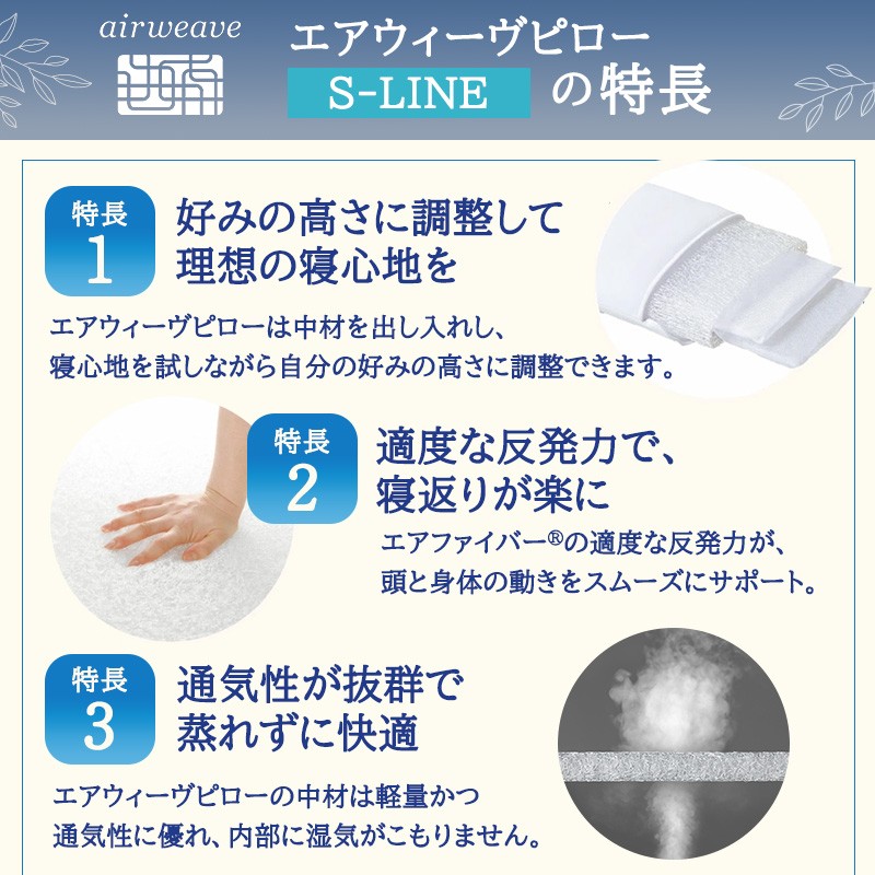 向けでも横向き寝でも、理想的な頭の高さをキープするため、ピローの両サイドを中央に比べて硬く調整しました。枕の表面に凸凹をつけるのではなく、硬さ・柔らかさをエアファイバーの中で連続的に変化させているので、なめらかに寝返りを打つことができます。男性にも女性にも大人気の製品です。