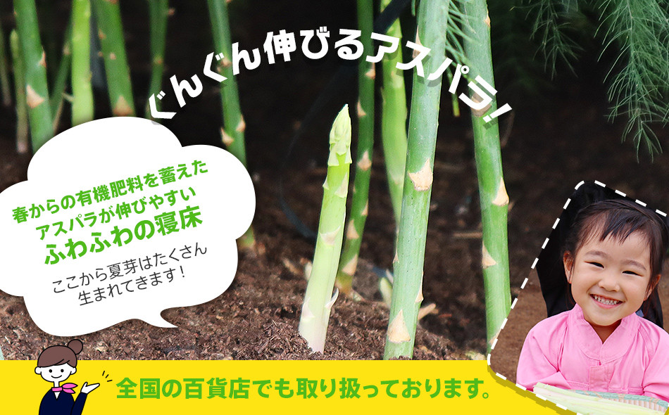 *ミネラル分が豊富な有機質肥料(骨粉・魚粕・油粕など)を使用し、毎日たっぷりと水をあげて、みずみずしく、甘いアスパラガスを育てています。