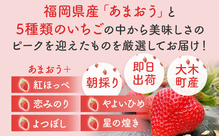 「あまおう」と「紅ほっぺ・恋みのり・よつぼし・やよいひめ・星の煌き」の中からおいしさのピークを迎えたものをいちご農家が厳選してお届けします。