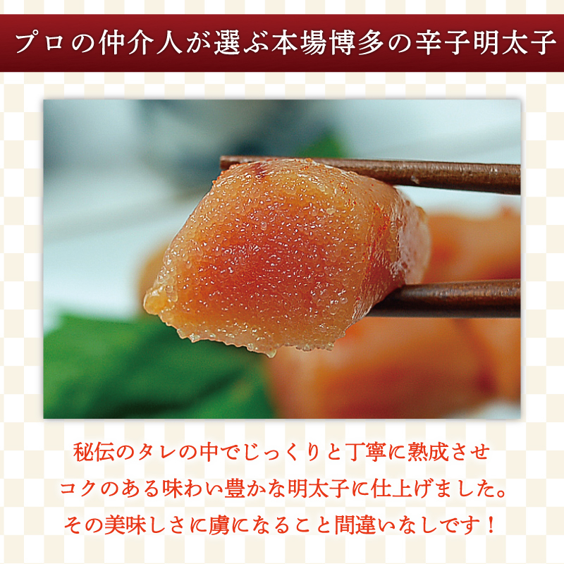 福岡県の魚市場 プロの仲買人が選ぶ宮近の辛子明太子。ご贈答品としてもおすすめな無着色の1本物です。福岡県の魚市場仲買人が選ぶ辛子明太子。北部九州の辛子明太子メーカーと言えば、地元福岡県の魚市場仲買人ならば誰しも候補に挙げるのが宮近の明太子。長年にわたり贈り物として関東や関西の方に定期的に送られる方が多い宮近明太子です。秘伝のたれの中で、じっくりと熟成させます。手間と時間をかけて、秘伝のたれの中で丁寧に熟成させたコクのある味わい豊かな一本物明太子。プロの水産仲買人、鮮魚店主が認める確かな品質の辛子明太子。化粧箱に入れ、専用包装紙でラッピングしてお届けいたします。