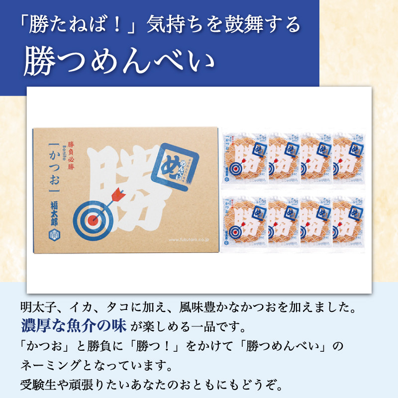 福太郎の代名詞ともなった、明太子のおせんべい「めんべい」。パリパリっと何枚でも食べられる食感と、程よい辛味と魚介の旨味が特徴です。定番の「プレーン」と人気の「マヨネーズ味」、優しい甘みの「玉ねぎ」、ハバネロを使った「辛口」、魚の旨味が倍増した「勝つ(かつお)」の様々な味わいをセットにした贈物に最適な「めんべい」です。