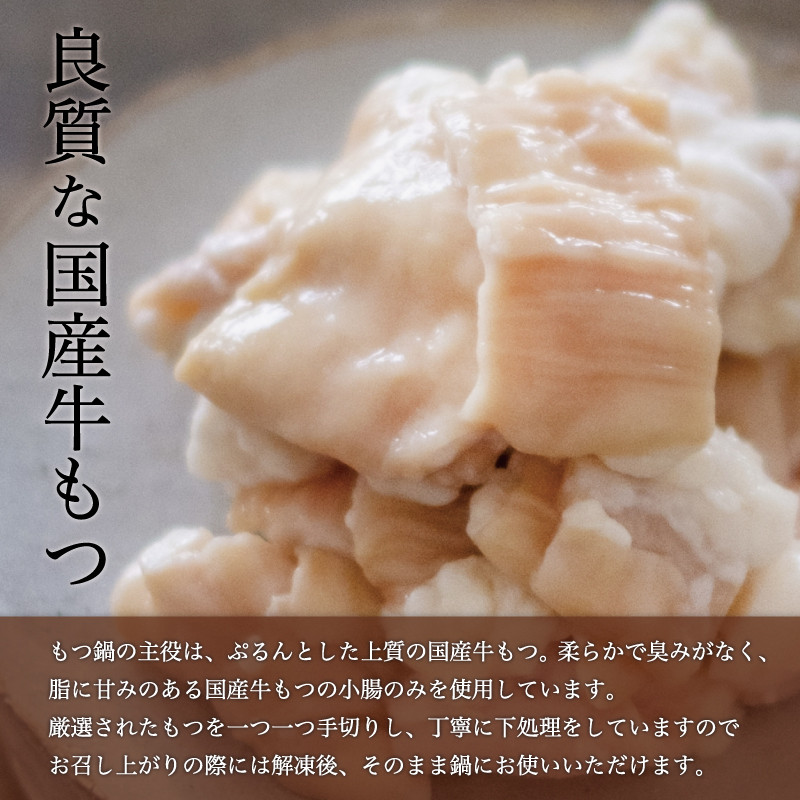 もつはぷるんっ!とやわらかで、噛むほどにもつの甘みや旨みが感じられる良質な国産牛もつの小腸のみを使用しています。もつの甘みを引き立てる特製醤油スープに、明太子のだしが溶け込んだ、博多ならではの「博多明太もつ鍋」です。明太子はたっぷり300g入っていますのでもつ鍋で使わなかった分はそのままご飯のおともやお料理にご利用ください。お好みの野菜を入れるだけで本場の博多もつ鍋が手軽に楽しめます。博多もつ鍋の〆はちゃんぽん麺でどうぞ。コシのある麺とスープがよく絡み、最後のひとくちまでお楽しみいただけます。野菜をたっぷりと食べられますのでヘルシーで意外にも女性ファンが多いもつ鍋です。もつは丁寧に下処理をしていますので解凍後すぐに調理いただけます。