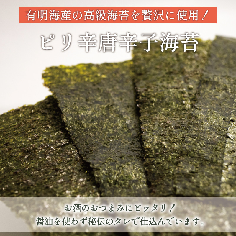 唐辛子のほんのりピリ辛が、海苔のうまみをググッと引き立てて、ごはんやおにぎりとの相性バツグンです。