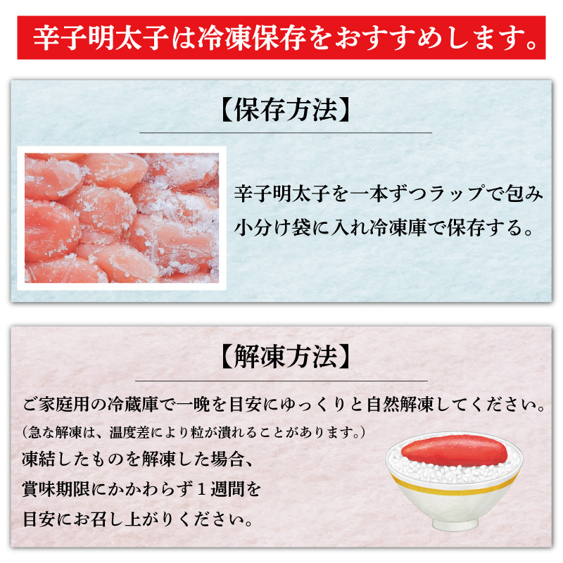 | 容量 | 辛子明太子 一本物 500g 1pc(化粧箱入り) |