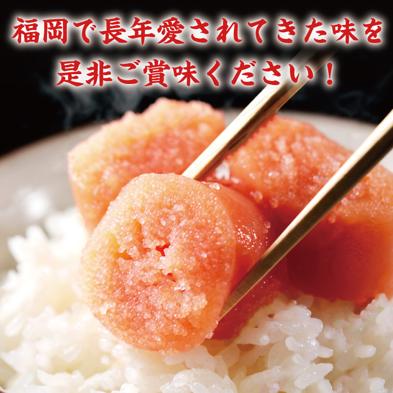 特製ダレで漬込み熟成された自慢の明太子の内、上質の切子のみを厳選し、たっぷりと1kgお詰めいたしました。大粒で粒感いっぱいの物のみだからこその、最高のプチプチ感をお届け致します。辛味の苦手な方にも食していただけるように、程よい辛さに仕上げております。