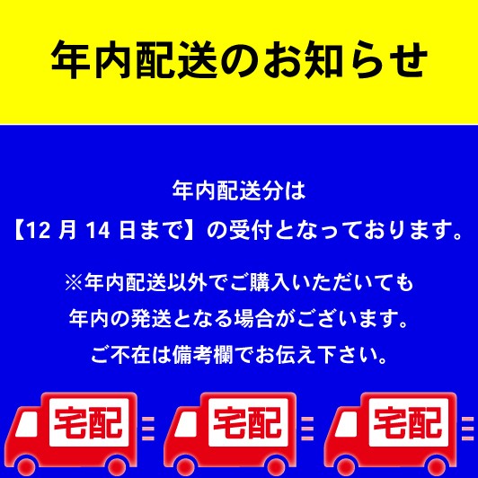 | 申込期日 | 通年対応 ※年内配送分は12月14日までの受付となります。 ※【年内配送以外】でご購入いただいても年内の発送となる場合がございます。ご不在は備考欄でお伝え下さい。 |