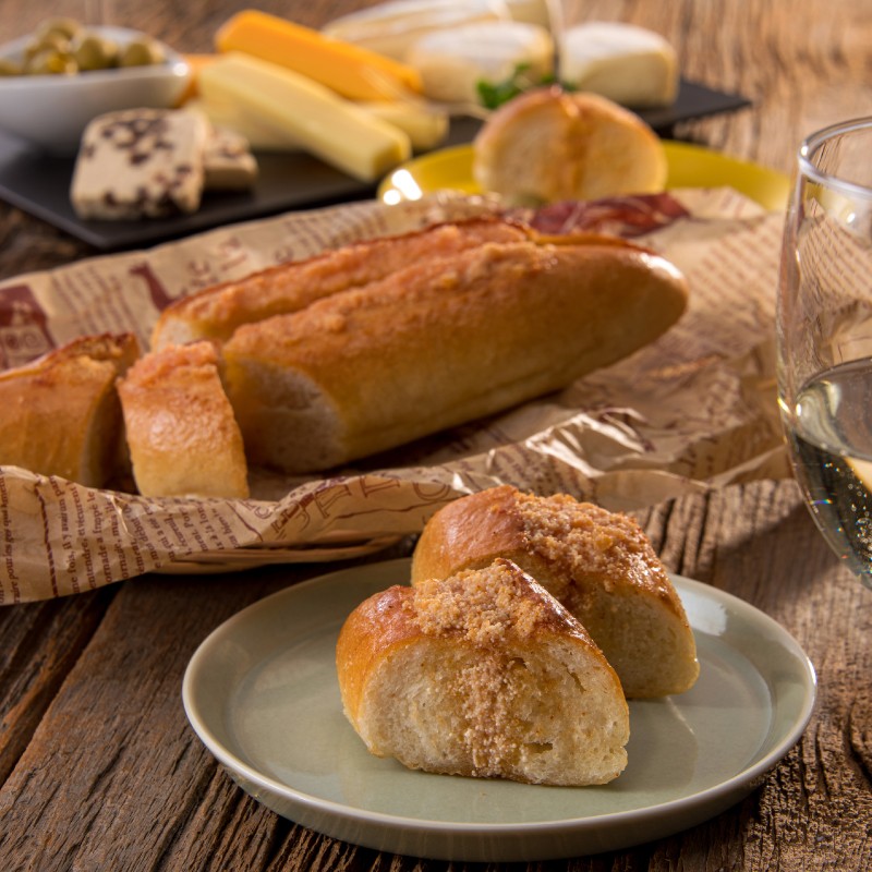 明太子屋こだわりの無着色明太子と国産の無塩バターを使った【特製明太バター】をフランスパンにたっぷりと塗りこみました。