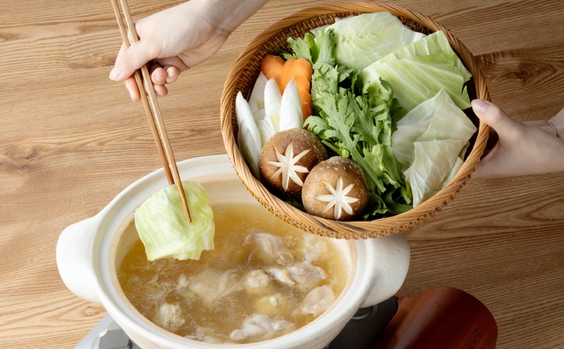 ③鶏肉に火が通ったら、お好みの野菜を入れ、火が通るまで加熱してお召し上がりください。 (白菜、白ねぎ、豆腐、きのこ類(椎茸やしめじ)、春菊などの野菜、しらたき、餅など)