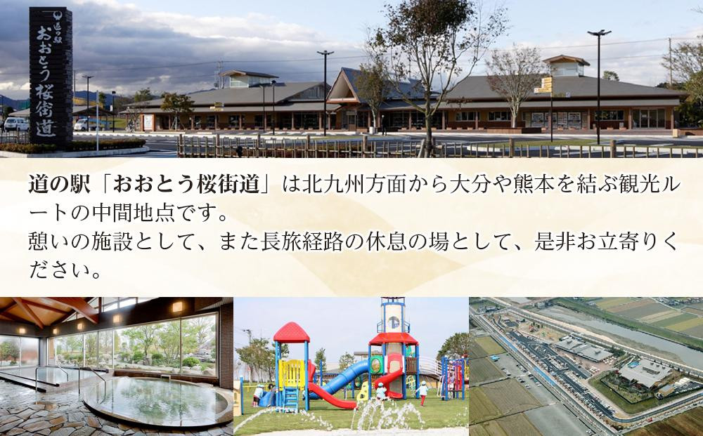 平成22年10月にオープンした「道の駅おおとう桜街道」は、イチゴやマンゴー、お米や野菜などの農産物が並ぶ物産館の他にも、1億円トイレ、天然温泉、薬石浴、フードコート、子ども広場、ドッグラン、花公園などがあり、三世代が一日中遊べるスポットとして、年間120万人を超す多くの観光客が訪れています。また、冬は九州のイルミネーションランキングでも上位にランクインするイルミネーションが有名で、県内外から多くの家族連れやカップルが訪れます。