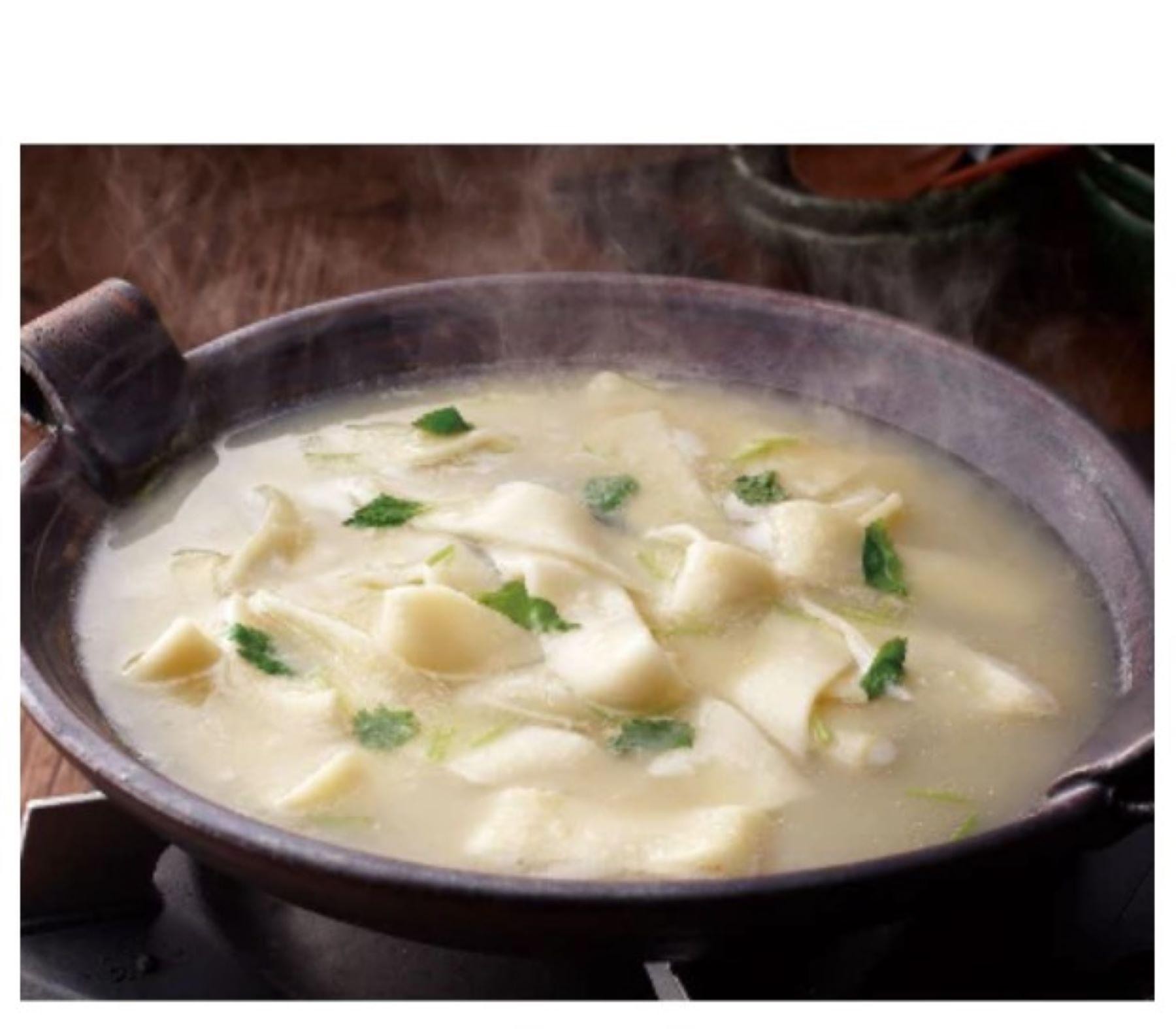 〆のやせうま風極太平麺は、スープの旨味をたっぷり含んで、お子様にも人気の珍しい麺です。