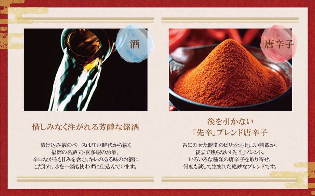 後を引かない「先辛」ブレンド唐辛子、九州産の柚子、まろやかな旨みを引き出す羅臼昆布、名蔵元「喜多屋」のお酒で、深い味わいに仕上げています。