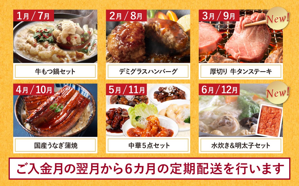 入金日の翌月から発送 ※毎月(年6~12回)のお届け 【1月・7月】【訳あり】牛もつ鍋セット(2人前×5) 10人前 【2月・8月】 デミグラスソースハンバーグ20個セット(ビーフ・合挽 各10個) 【3月・9月】厚切り 牛タンステーキ 塩レモン(900g) 【4月・10月】 国産うなぎ蒲焼4尾(620g以上) 鰻蒲焼用タレ・山椒付 【5月・11月】中華5点セット(5種×2袋 計10袋) 【6月・12月】博多若杉 水炊き(4~5人前)&明太子セット |