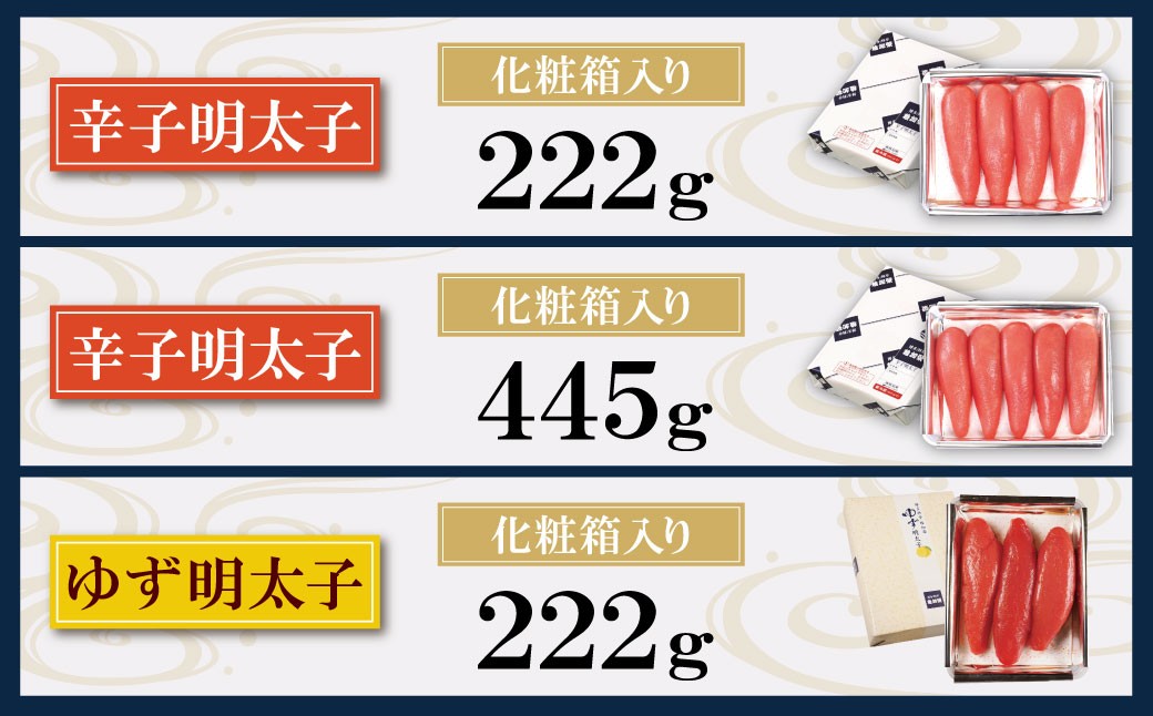 | 容量 | 【お好きなセット内容をご選択いただけます】 ・辛子明太子222g(化粧箱入) ・辛子明太子445g(化粧箱入) ・ゆず明太子222g(化粧箱入) |