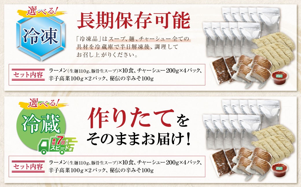 | 容量 | ラーメン(生麺110g、豚骨生スープ)×10食、チャーシュー200g×4パック、辛子高菜100g×2パック、秘伝の辛みそ100g |