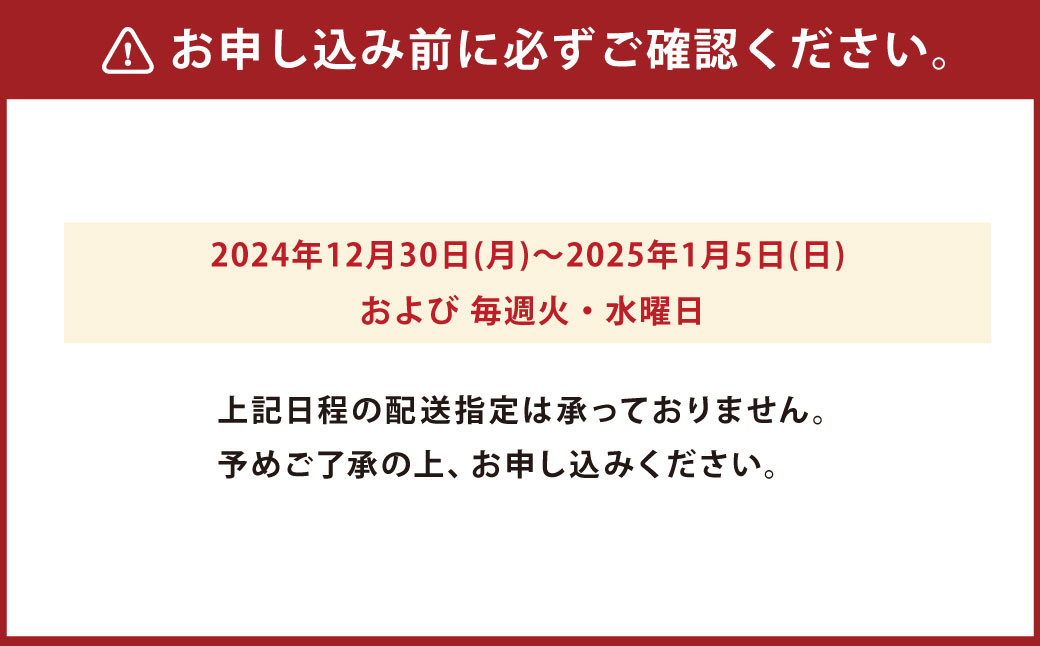 寄附確認後、30営業日以内に発送予定 年末年始(12月・1月)は寄附確認後、60営業日以内に発送予定 ※天候や発送状況により多少前後する場合がございますので、予めご了承ください。 【 配送不可地域 】 北海道・沖縄・離島 |